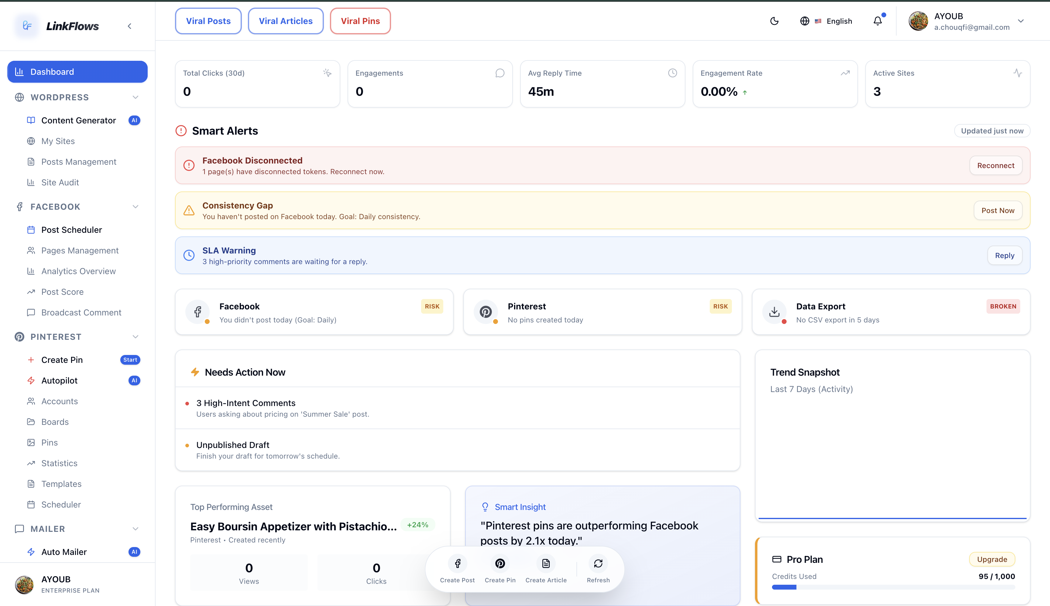 Linkflows is your AI content & social media growth agent. It writes SEO content, publishes to WordPress, pins to Pinterest, shares to Facebook, and grows your email list. Fully automated.